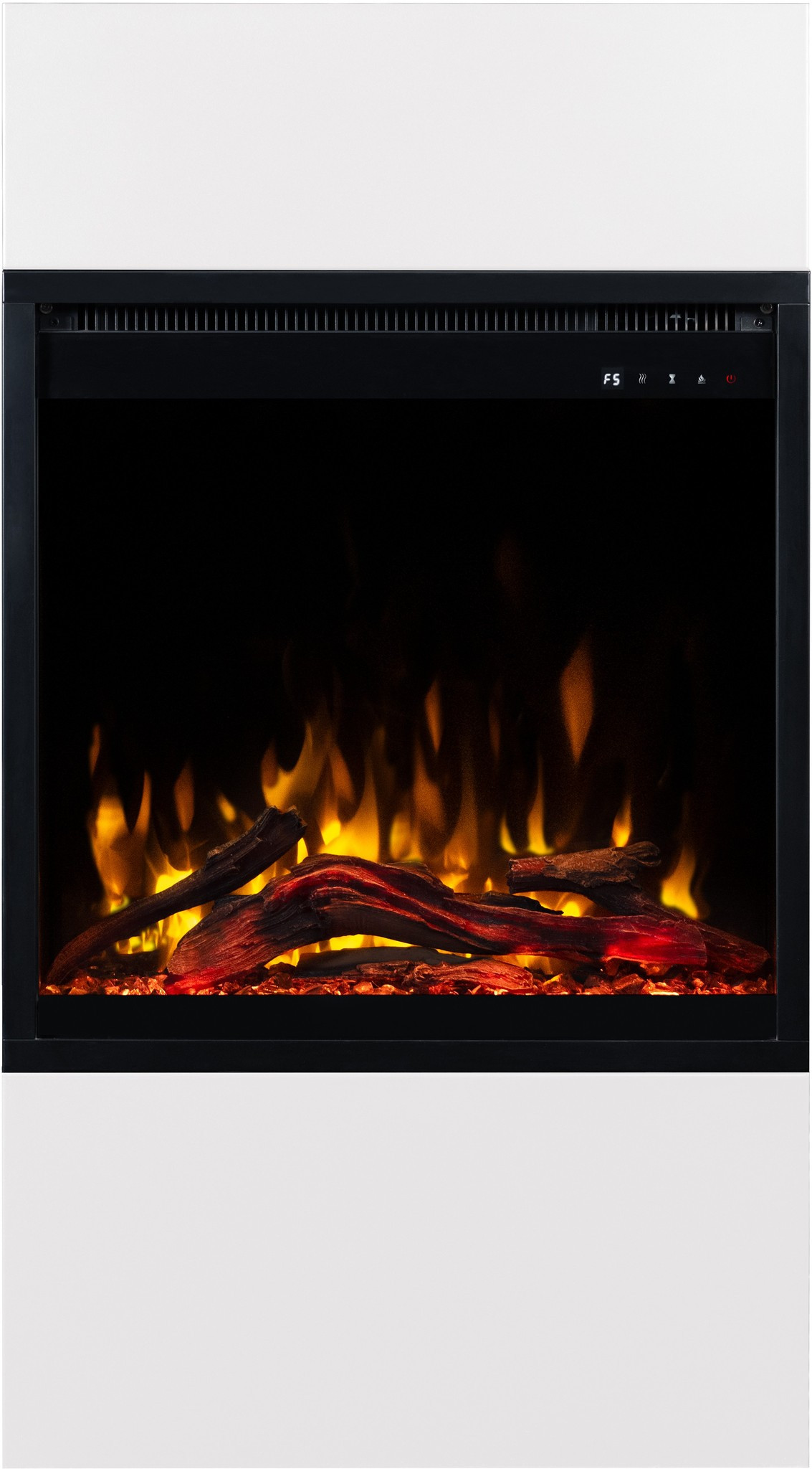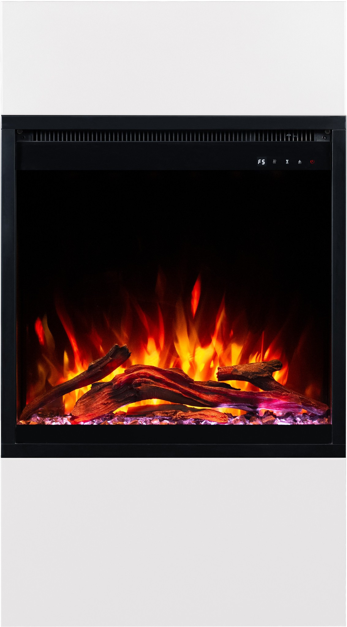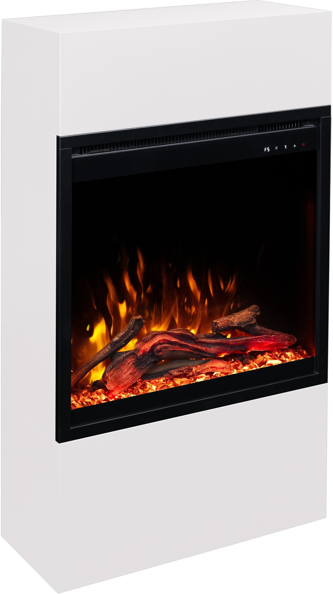 Dzięki wkładowi AFLAMO PLUS 3D kominek elektryczny Milos zachwyca niezwykle realistycznym efektem płomienia. Półprzezroczyste polana i żarzące się palenisko sprawiają, że płomień wygląda jak prawdziwy.