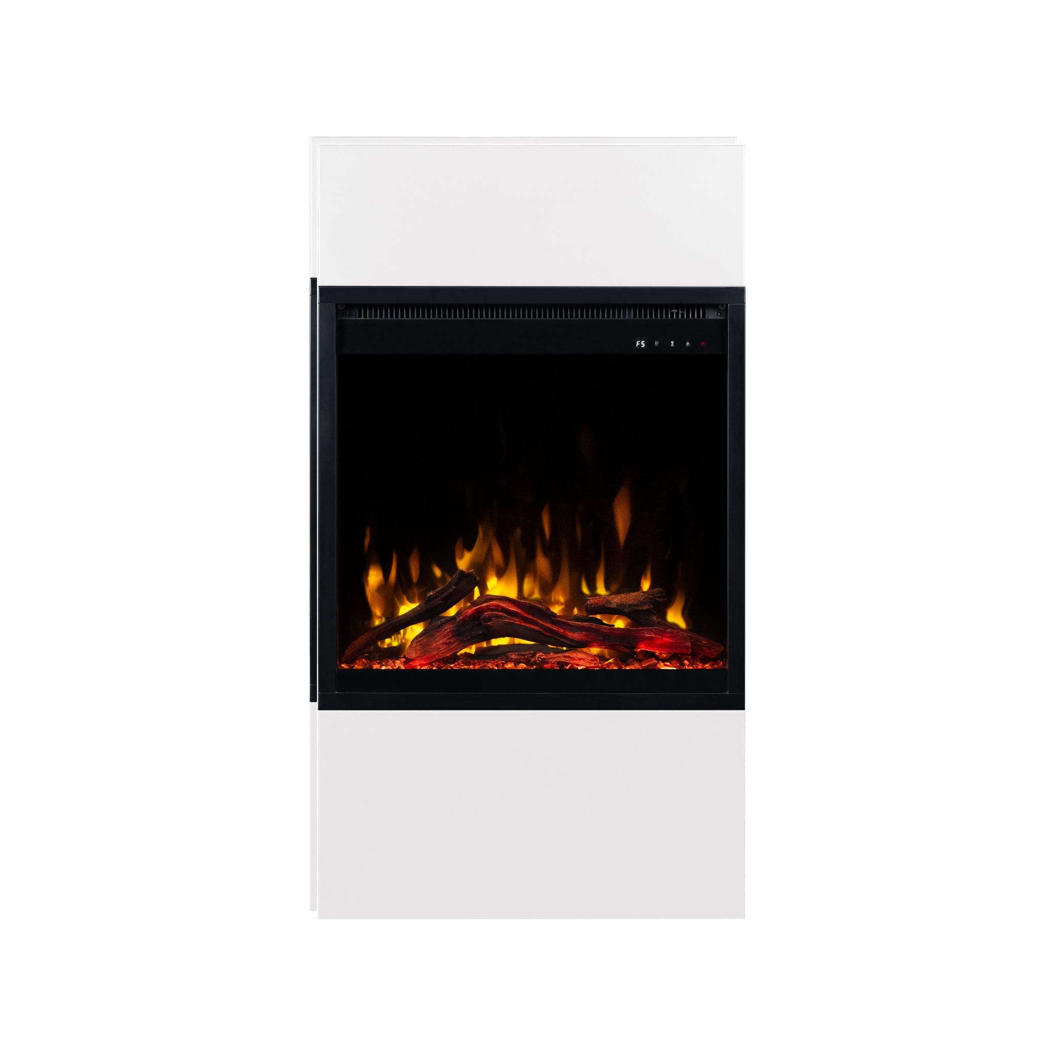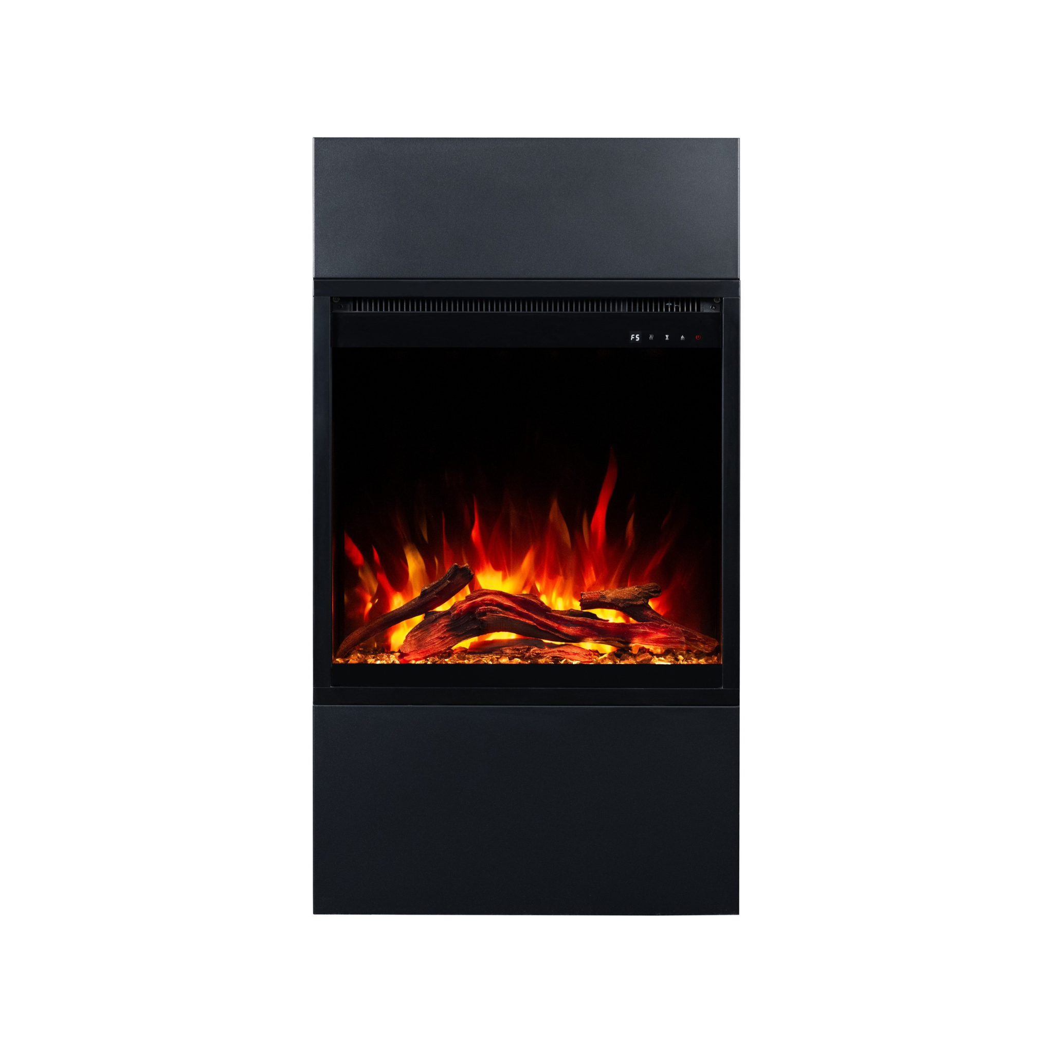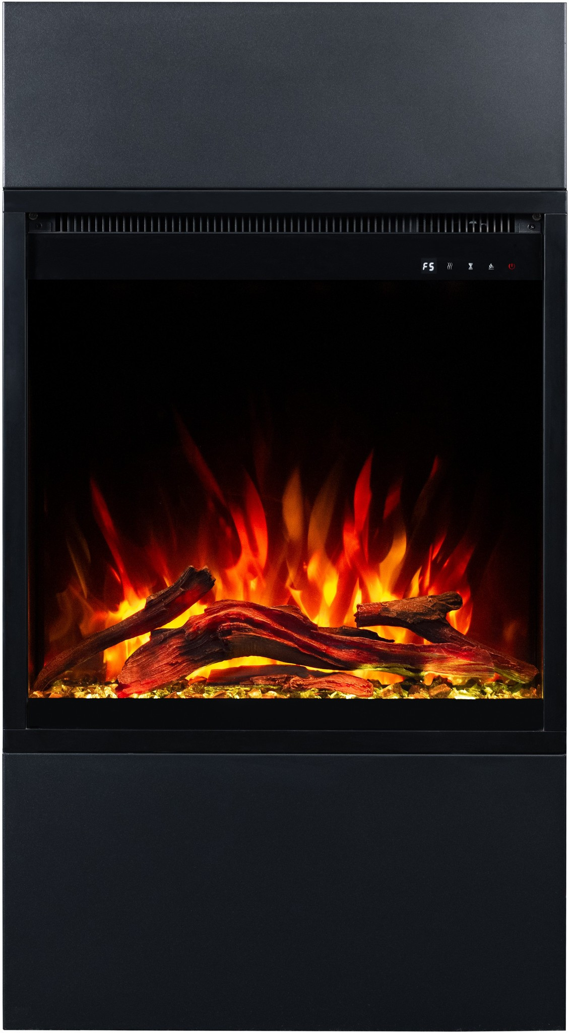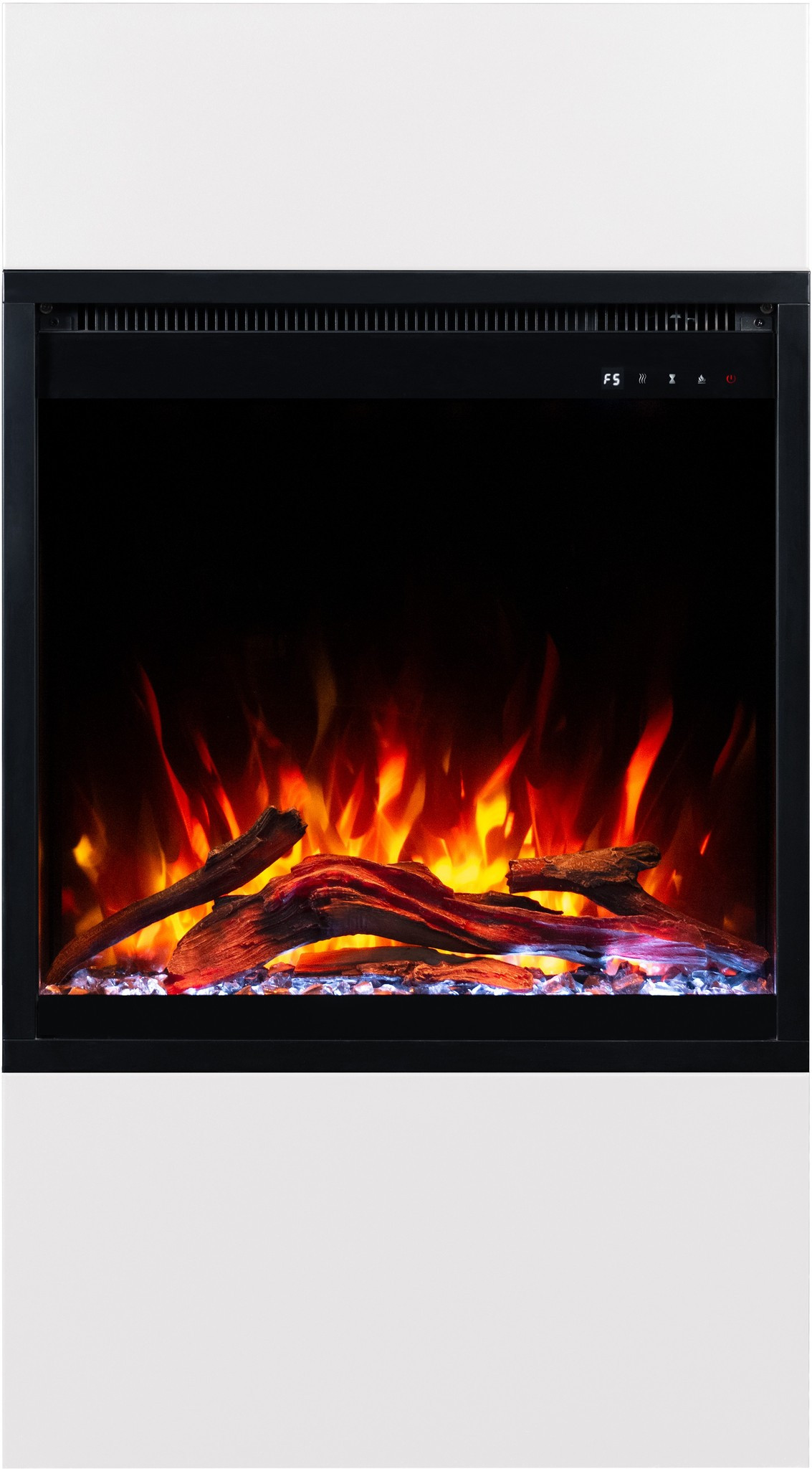 Dzięki wkładowi AFLAMO PLUS 3D kominek elektryczny Milos zachwyca niezwykle realistycznym efektem płomienia. Półprzezroczyste polana i żarzące się palenisko sprawiają, że płomień wygląda jak prawdziwy.