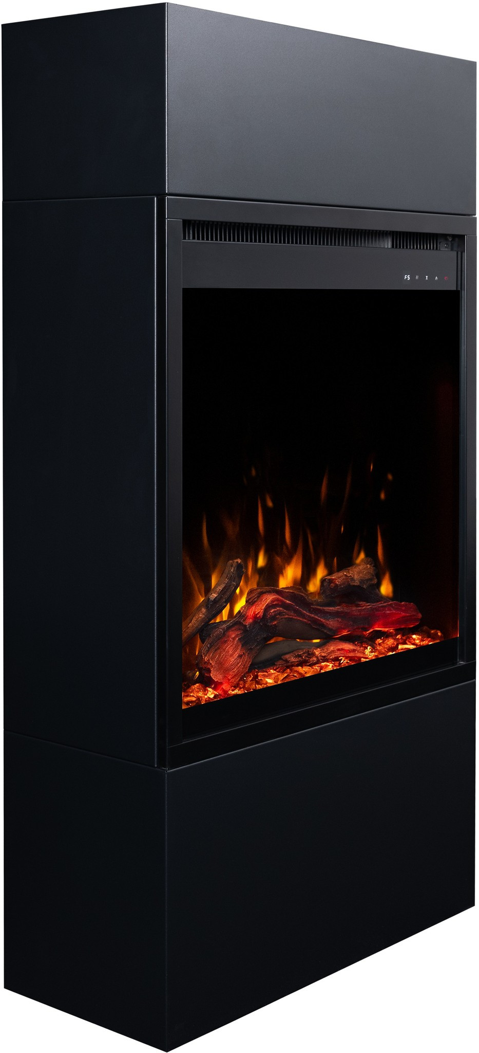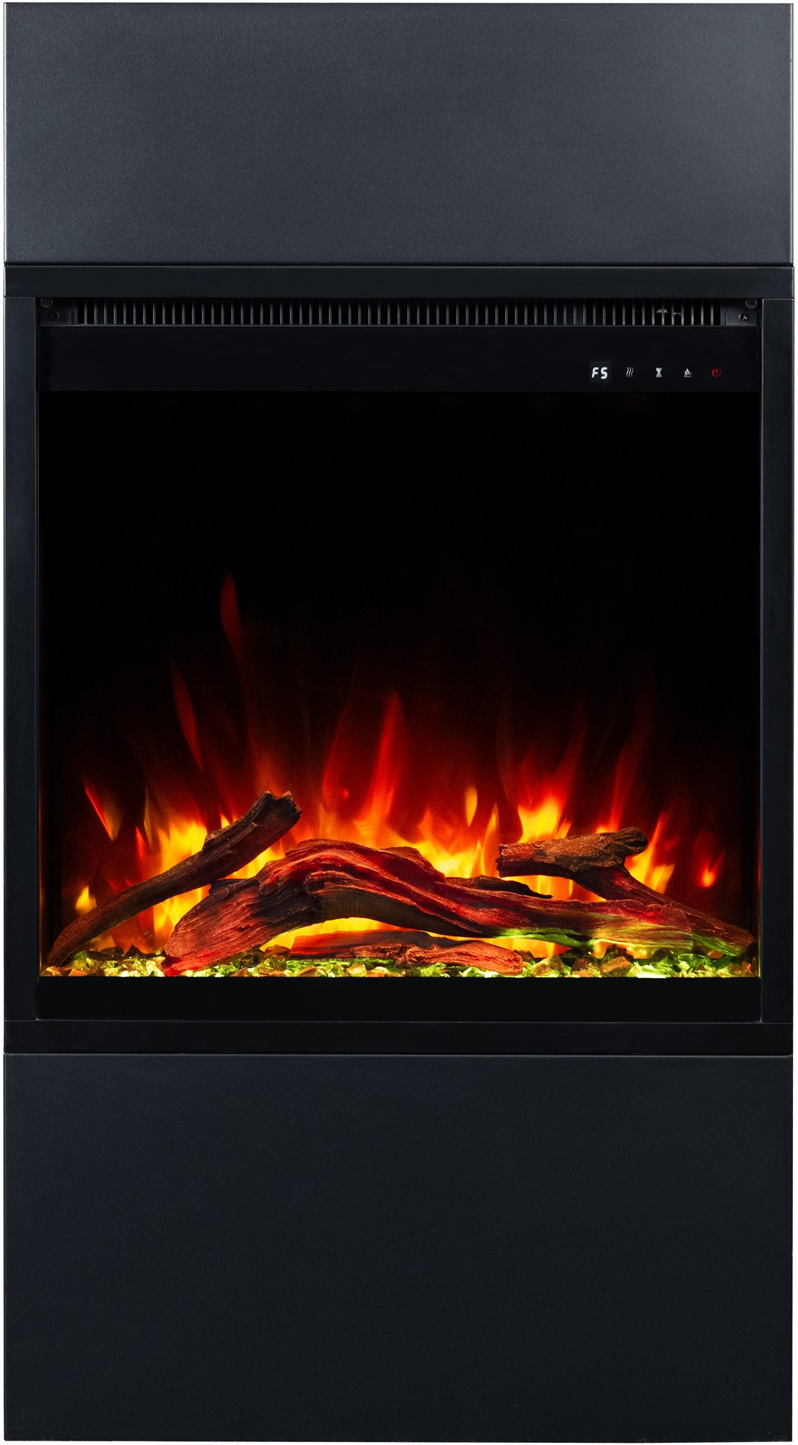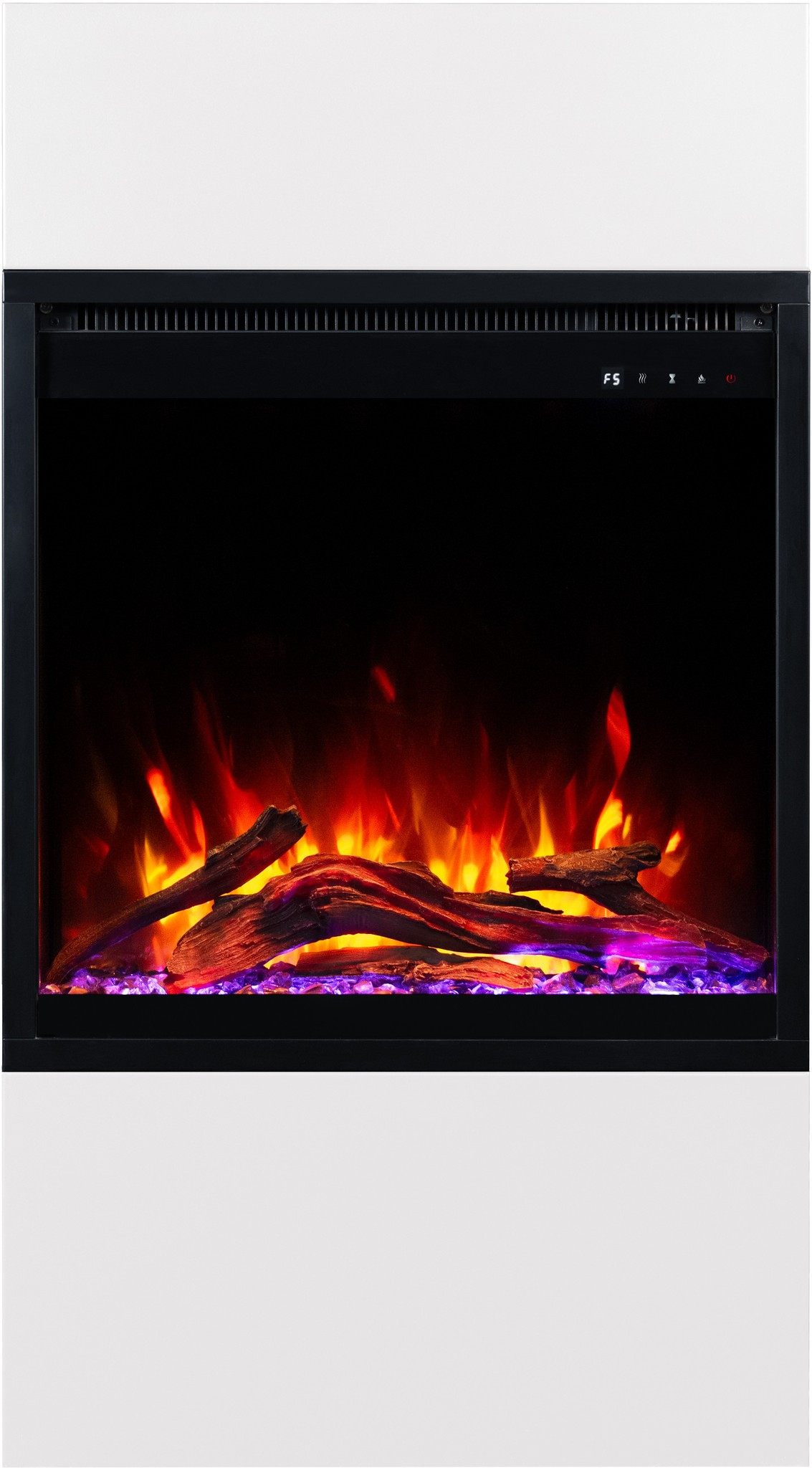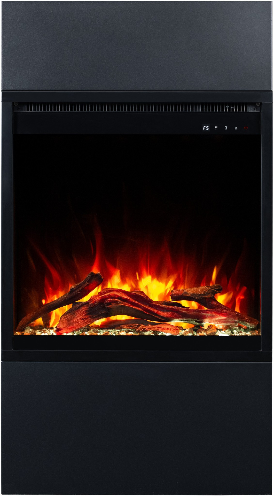 Dzięki wkładowi AFLAMO PLUS 3D kominek elektryczny Milos zachwyca niezwykle realistycznym efektem płomienia. Półprzezroczyste polana i żarzące się palenisko sprawiają, że płomień wygląda jak prawdziwy.